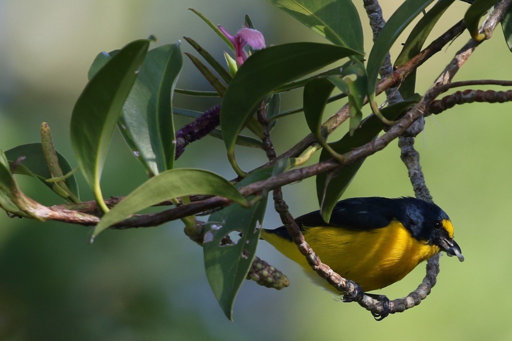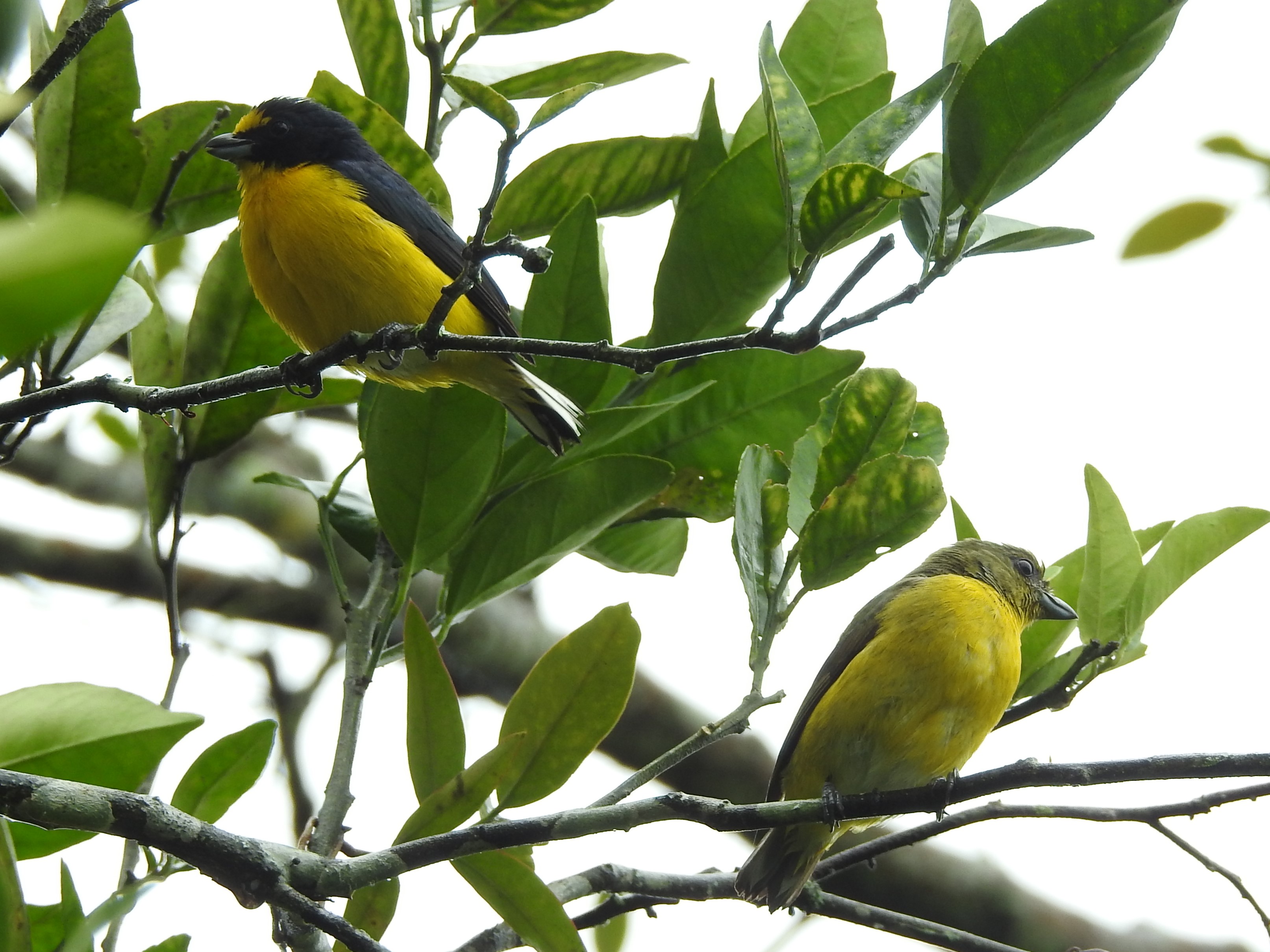 Many euphonia species are seed eaters, but the Yellow-throated prefers berries, especially mistletoe. Euphonias are sexually dimorphic, with the males being easier to identify than the females: