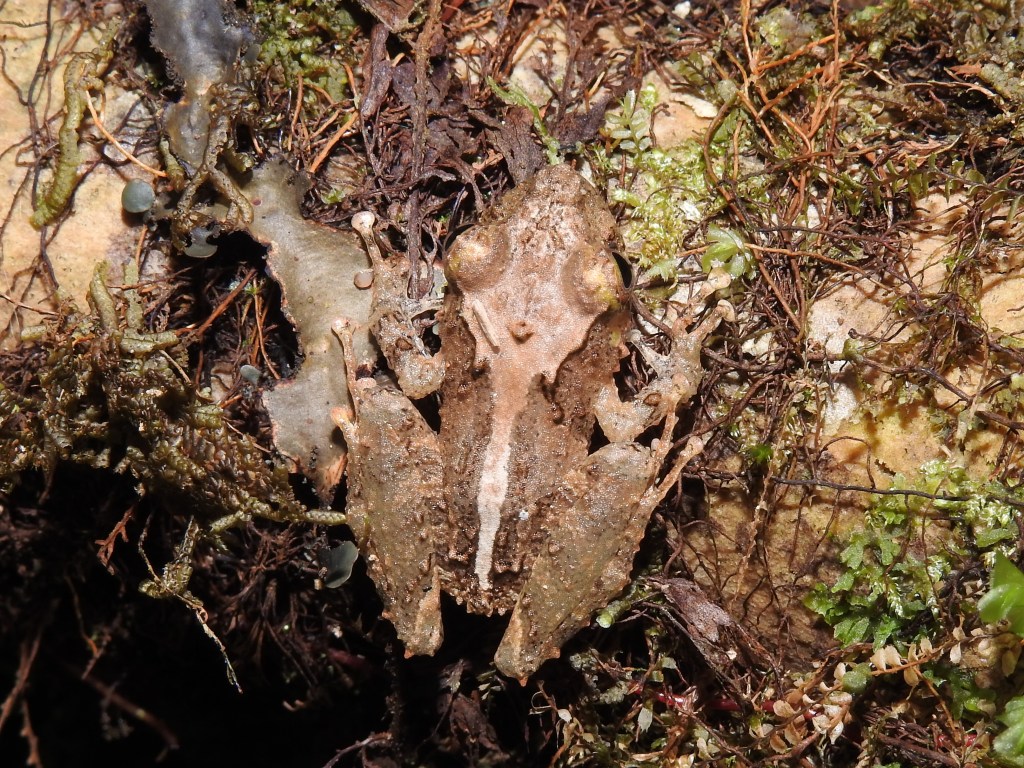 …..and to many other interesting creatures. Superb natural camouflage renders the outline of the following amphibian not immediately obvious. If you can identify the species, please do let me know.