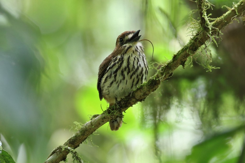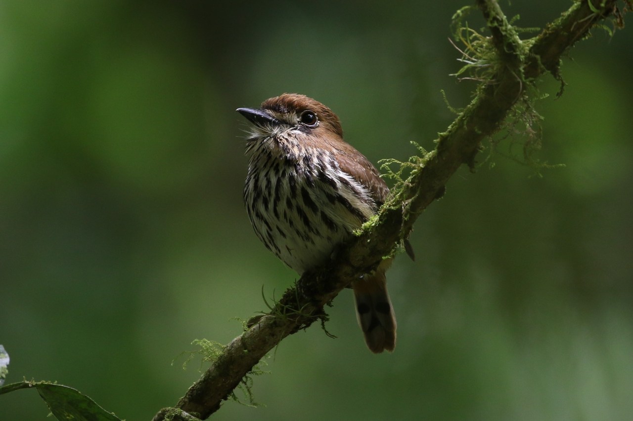 No other Costa Rican puffbird combines brown upperparts with such heavily streaked white underparts. However, I suppose the female White-whiskered Puffbird (Malacoptila panamensis) – see below – might conceivably be confused, but that red-eyed species measures 8″ in length and lacks the strongly contrasting black streaks that characterise the Lanceolated Monklet. It is fairly common on both the Caribbean and Pacific slopes, although like many puffbirds it can be maddeningly hard to find. For comparison purposes, here’s the female from a pair that I reported on in July 2017 from Paso Marcos in Cabécar indigenous territory on the Rio Pacuare: