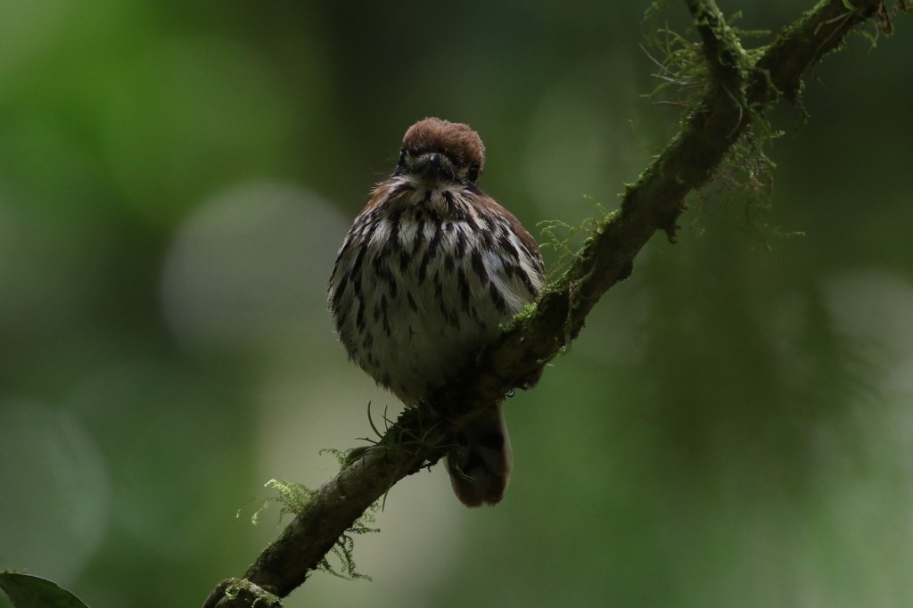 Earlier this month friend and guide Steven Aguilar Montenegro was again invaluable in locating this, the rarest of Costa Rica’s 5 puffbird species, at the Refugio de Vida Silvestre La Marta, near Pejibaye, where its presence was first reported some two years ago. Steven has referred to the monklet, the sole representative of the genus Micromenacha, as un fantasma del bosque, a forest ghost, because locating it is so notoriously difficult. Once found, puffbirds are in general faithful to their particular area, yet they can be maddeningly elusive. For example, the Rio Tuis near Turrialba has long been known to hold a small population of Lanceolated Monklets but the vast majority of searches are fruitless. Fortunately, the birds at La Marta have been able to be relocated recently in several different areas within the Refuge, both along the river, at the aqueduct ruins, and even at the general picnic area.