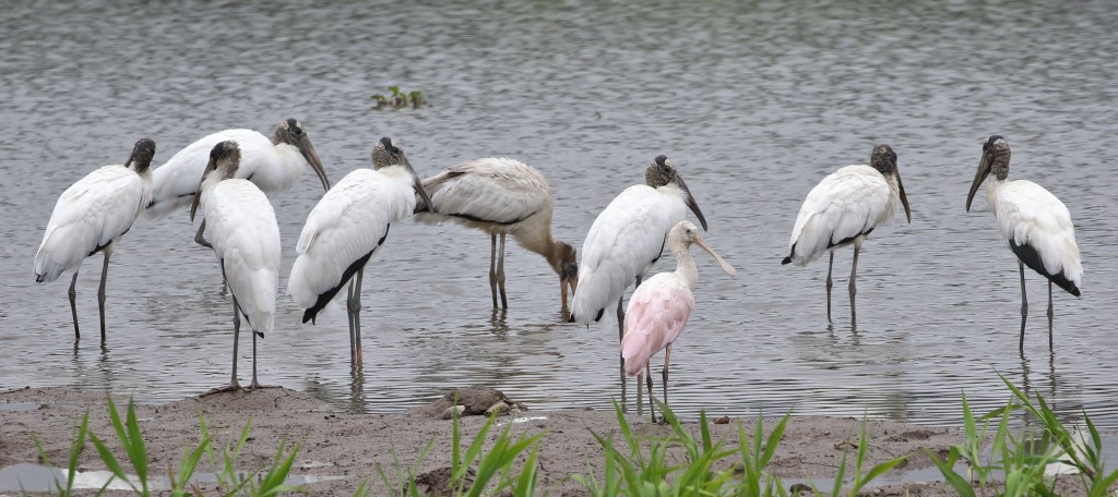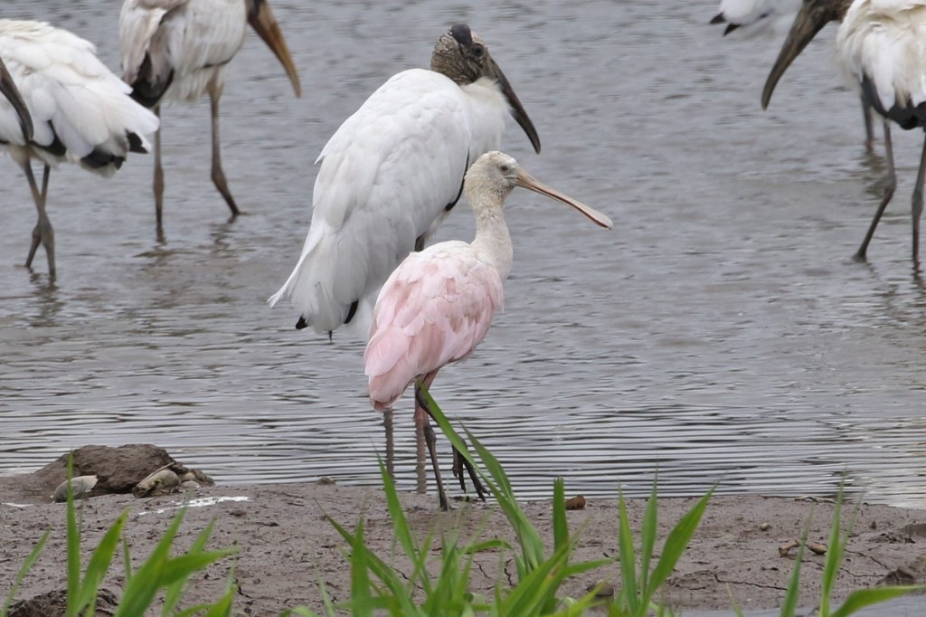 Spoonbill with Wood Storks at Angostura; photo by John Beer