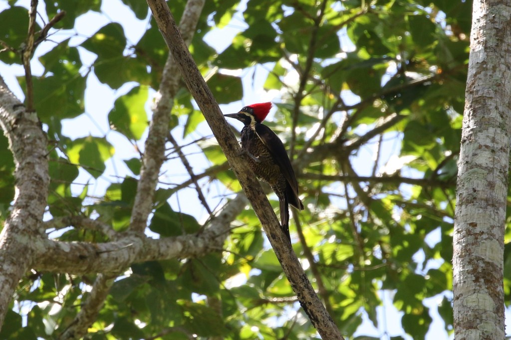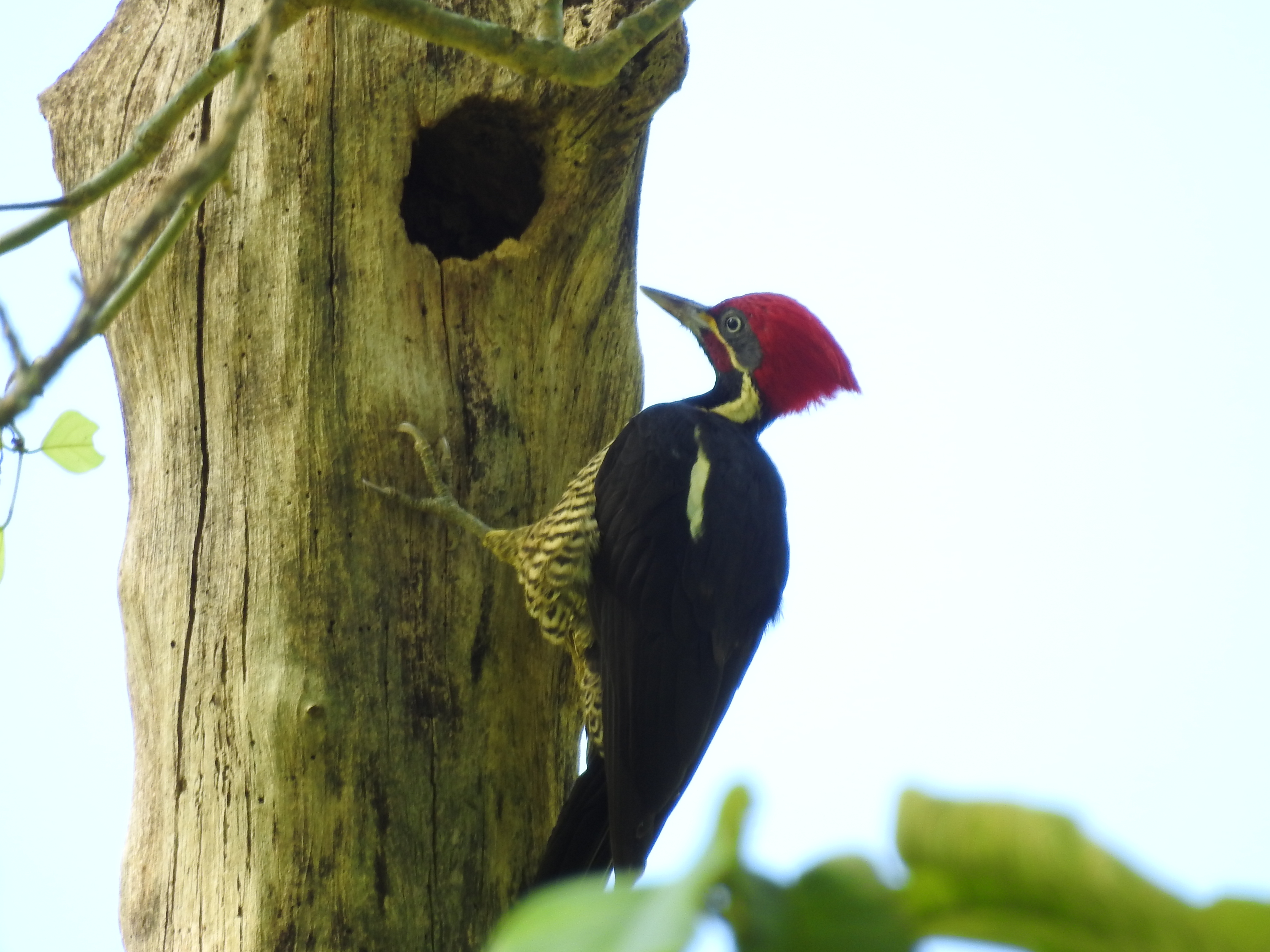 Of the 16 species of woodpecker found in Costa Rica the Lineated Woodpecker is the biggest. It shares this billing with the look-alike Pale-billed Woodpecker (Campephilus guatemalensis), a forest bird that I am unlikely to find close to home on the Turrialba Volcano slope. The Lineated has a white line (hence its name) running from the neck across the lower part of its head. Note, however, that the dark bill of the Lineated supposedly becomes progressively lighter the further south you travel in Costa Rica. This should not cause any confusion with the Pale-billed, since the latter has white on the neck but not on the head. This first photograph is from the Represa Angostura very close to Turrialba: