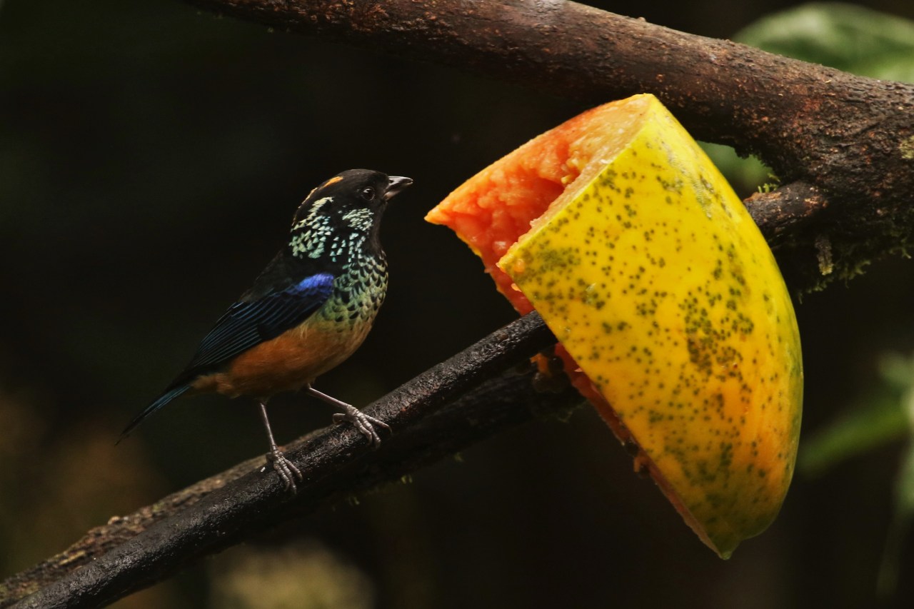 A short trip up the volcano slope from our house brings me to a spot above the hamlet of Calle Vargas at around 1,600 m where I can often find a small family group of this beautiful tanager. Its Spanish name (literally, ‘chestnut-bellied tanager’) indicates a key feature not shared by other tanagers here. The range of this endemic species is restricted to only the higher elevations of Costa Rica and western Panama. Good lighting, patience and some luck are usually needed to highlight its stunning plumage: