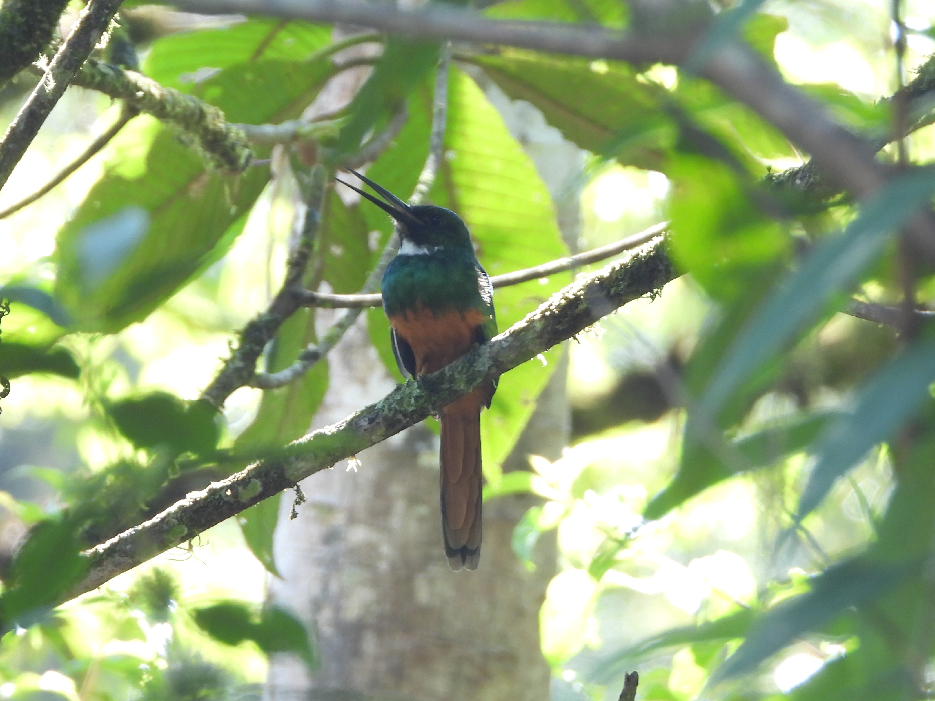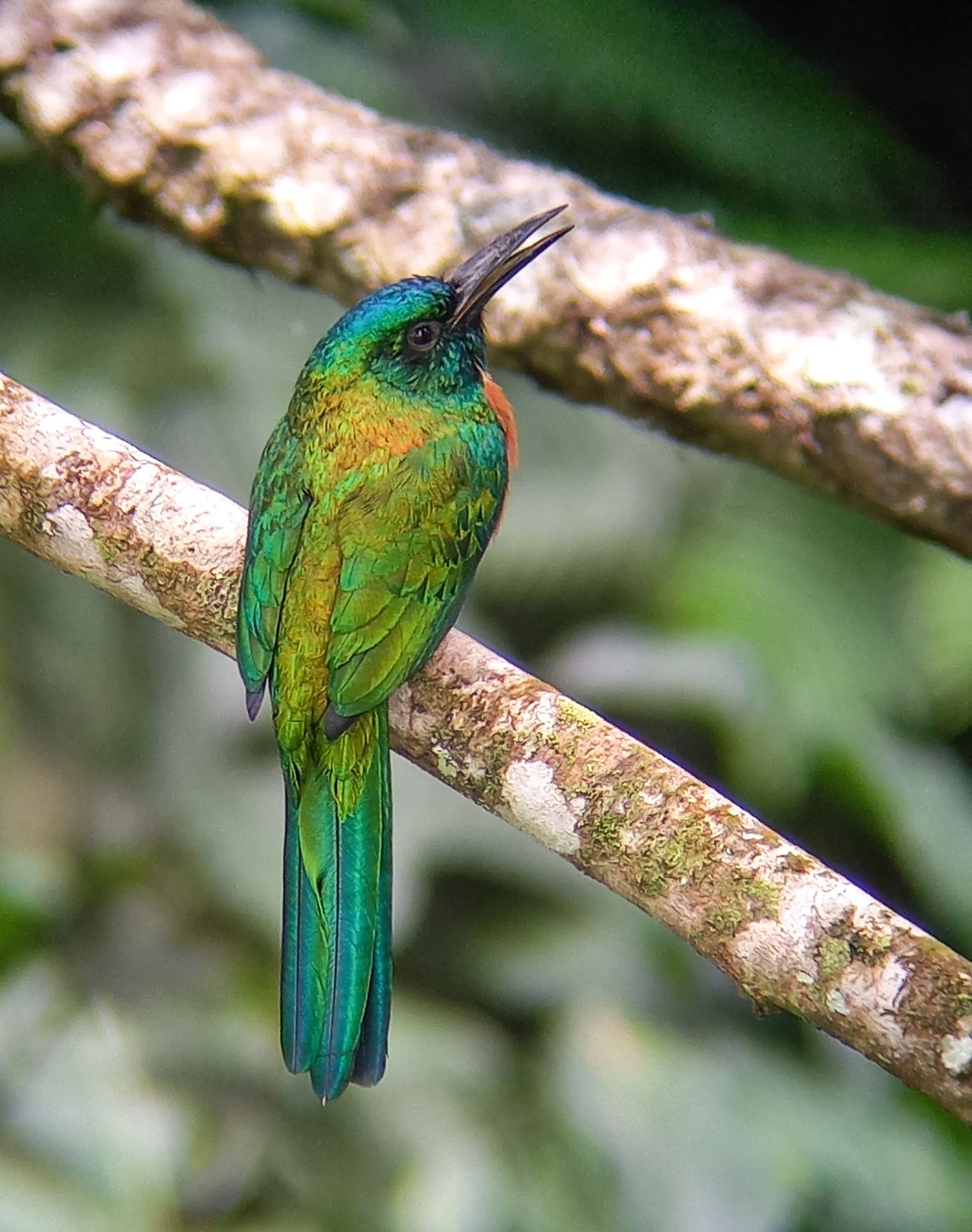 The Great Jacamar measures some 12″ in length and is one of only two jacamar species found in Costa Rica. It ranges from eastern Honduras south all the way to northern Bolivia and Brazil´s Mato Grosso. It´s a medium-sized bird measuring about a foot in length but it’s an extremely rare species. You’re most unlikely to bump into it anywhere in Costa Rica, and certainly not in our province of Cartago. I myself haven’t had such good fortune yet. Almost all Costa Rican records of this beautiful bird come from the Caribbean lowlands, with just one verified sighting (2013) out of normal range, which was in Monteverde, at around 800 m elevation by top Costa Rican birder Pat O´Donnell.