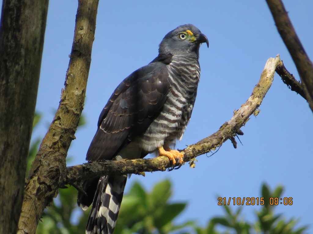 At first I had some difficulty in identifying the male bird because its predominantly grey-black upperparts and whitish lower breast suggested a Bicolored Hawk (Accipiter bicolor), a species that has occasionally appeared here. The birds’s behaviour each day was predictably the same: rather heavy, short-distance flight from tree to tree inside the garden pursued by mostly Clay-colored Thrushes, sounding the alarm call that usually indicates a nearby cat. As the days passed I was able to confirm lack of barring on the underparts and no sign of the rufous thighs of a Bicolored Hawk.
