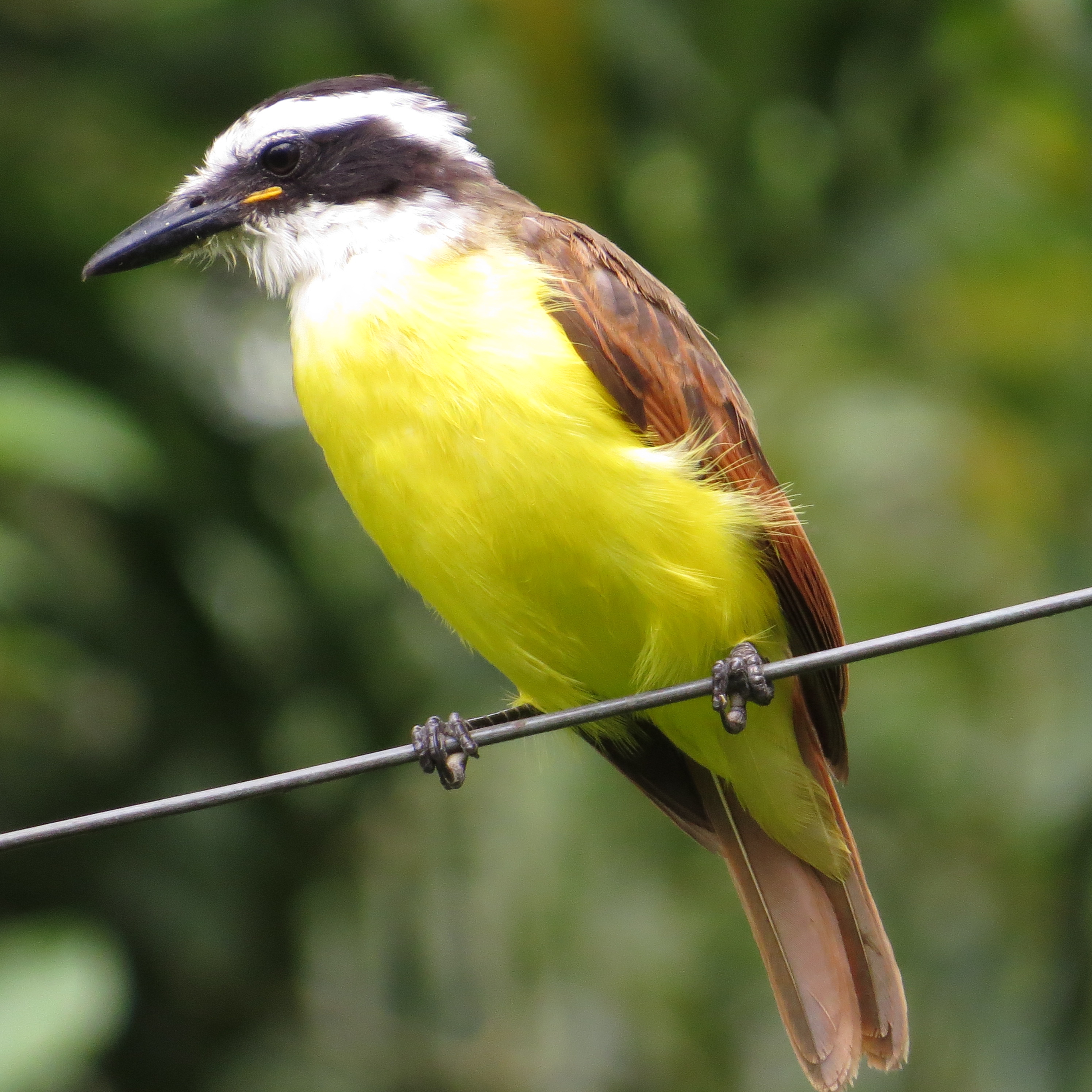 This is a big-headed, red-eyed flycatcher measuring fully 8″ in length and thus almost the size of the Great Kiskadee (Pitangus sulphuratus). The kiskadee, pictured below, is a very common and highly visible species found in almost every Costa Rican garden, including both mine and John’s: