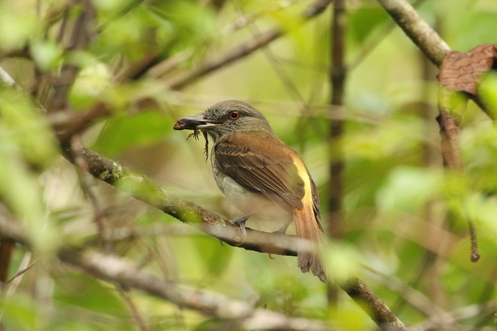 Attilas are aggressively predatory, hence the name, which alludes to Attila the Hun. Having spotted his next meal, our Bright-rumped Attila pounces, seizing a hapless small lizard: