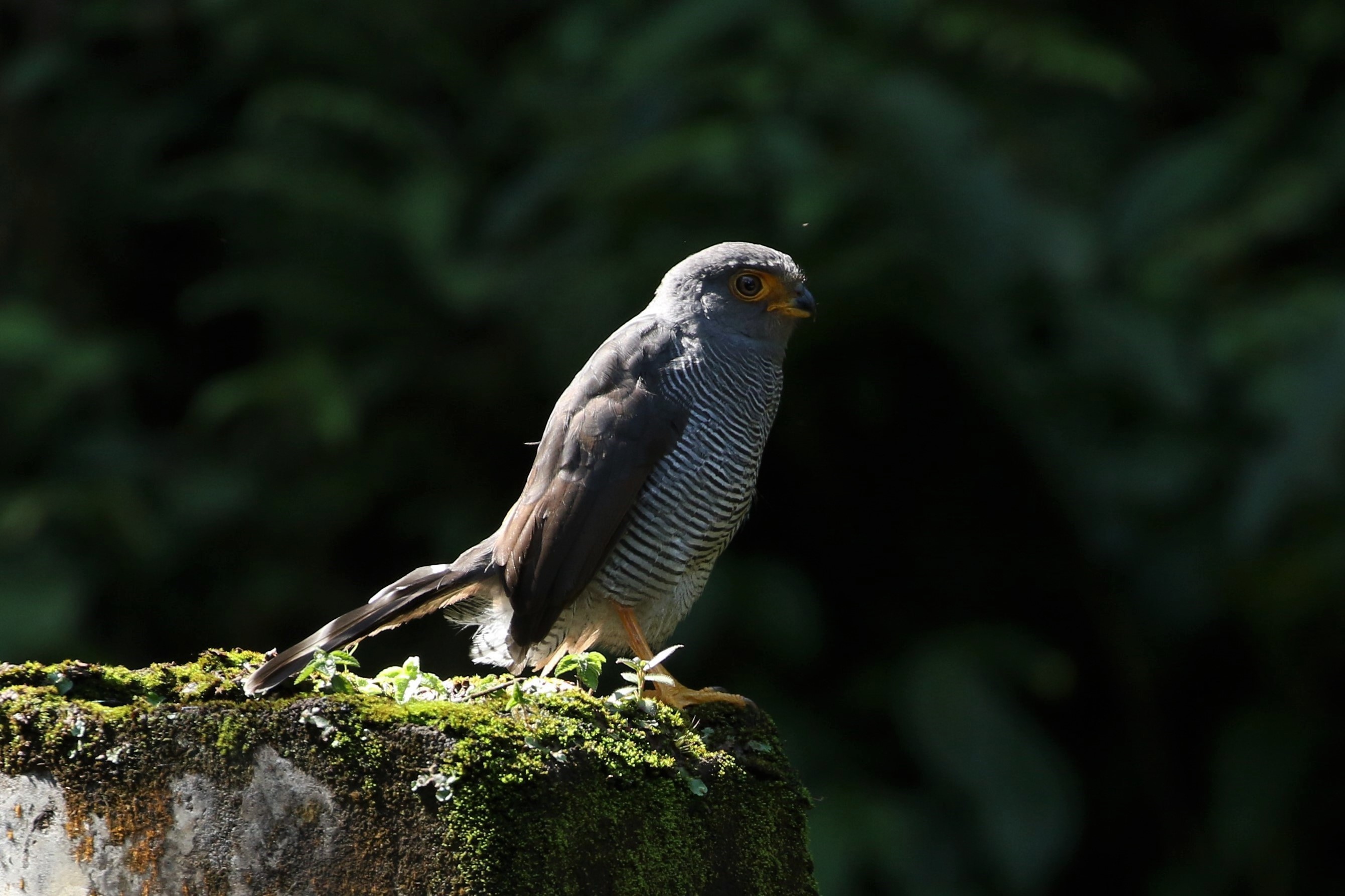 The bars on the underparts, which extend all the way down, exclude confusion with any of the country’s small raptors with the exception of the Tiny Hawk (Accipiter superciliosus), which chiefly preys on hummingbirds. However, the (even tinier) Tiny Hawk lacks the yellow orbital skin of the adult Barred Forest-Falcon.