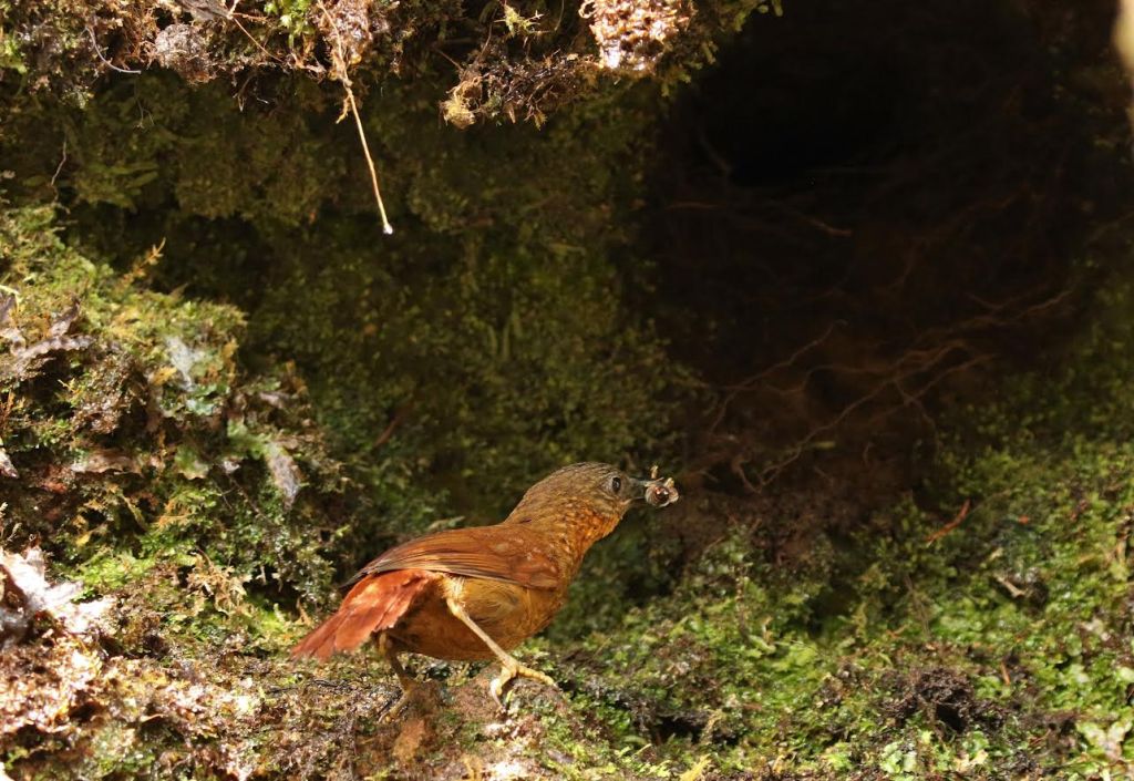 After a repeat trip to the site it was surmised that the Treehunter photographs taken at Los Bajos del Volcán could well be of two parent birds, even though only a single bird was visible at any one time. Here is a shot of what is perhaps the nest site, with one of the parent birds carrying what seems to be an insect pupa: