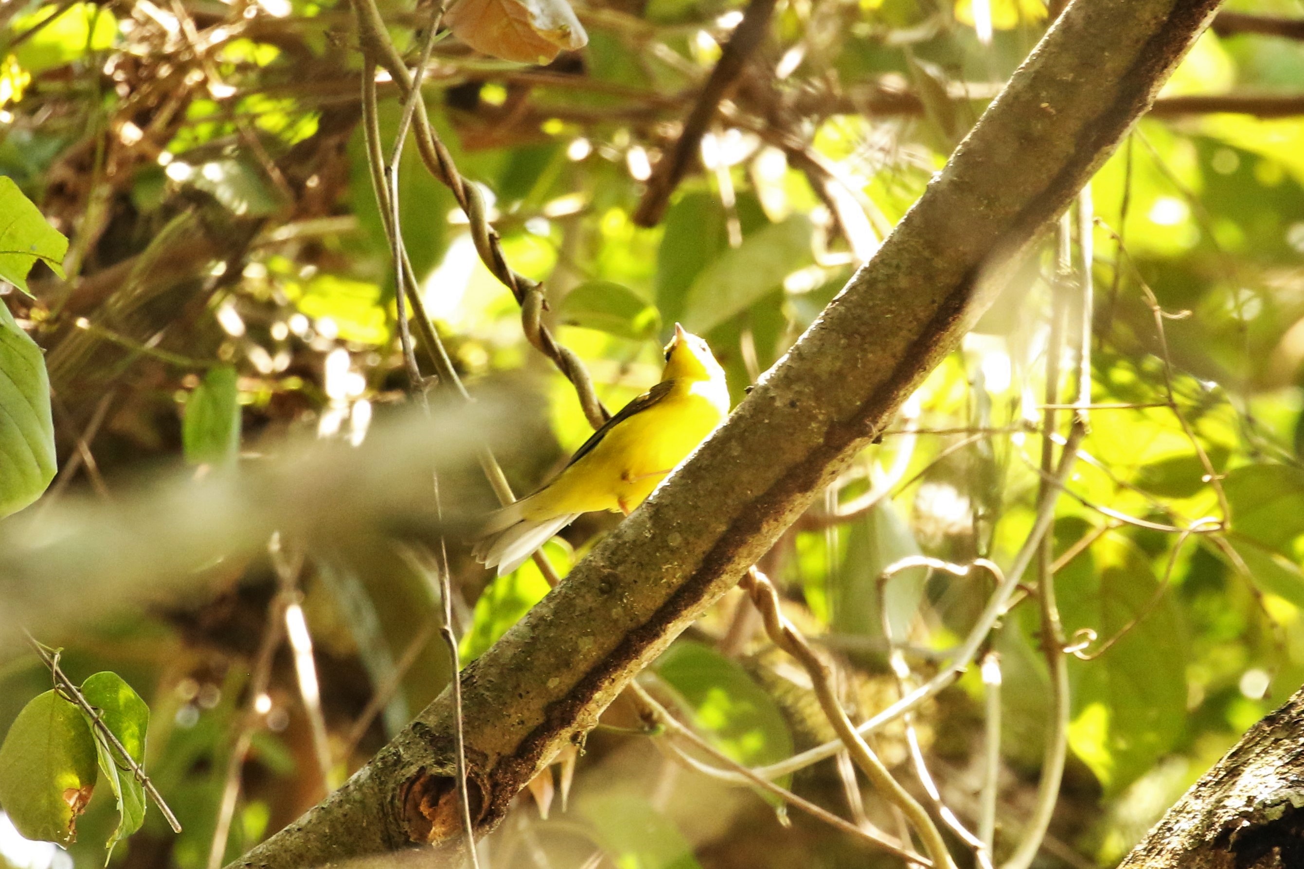 The female Hooded Warbler is a yellow bird, with mostly bright-yellow underparts; the black markings of the ‘hood’ are much less noticeable. The individual shown below was photographed fleetingly at Aquiares after being seen repeatedly for more than a week, beginning in mid-October of 2023. The clearly displayed white outer tail feathers are a diagnostic feature of Hooded Warblers, whether male or female. This individual is believed to be an adult female: