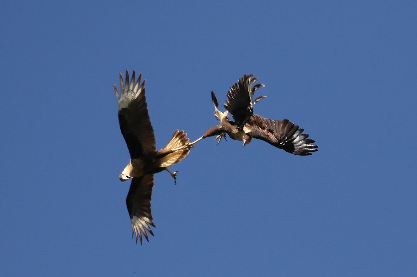 What follows is a remarkable sequence of Crested Caracara images shot on a day of clear-blue skies. The pair is captured as if tussling in courtship: